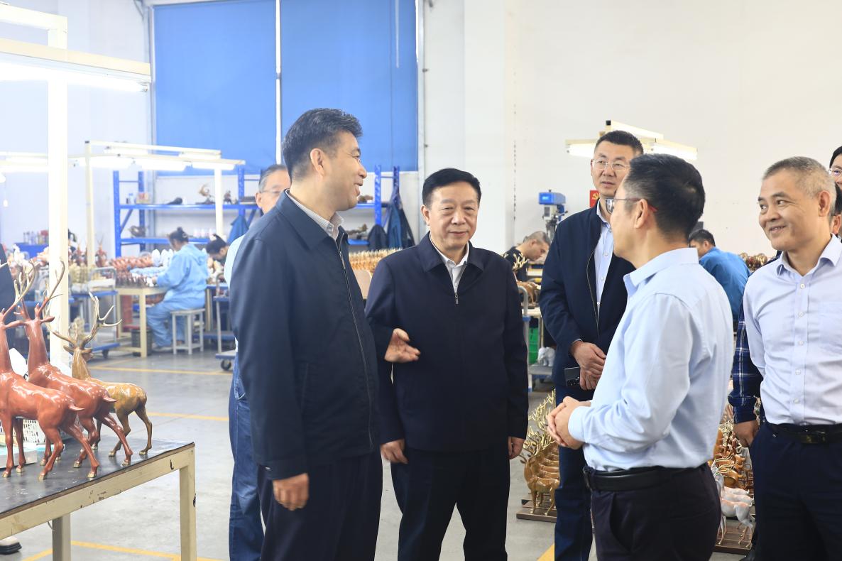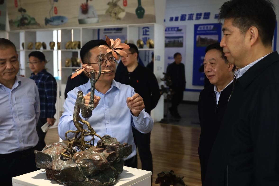 公司負(fù)責(zé)人郭飛陪同參觀并匯報(bào)了企業(yè)生產(chǎn)經(jīng)營、市場(chǎng)銷售、非遺技藝傳承等情況。調(diào)研組深入車間詳細(xì)了解銅工藝品制作技藝、工藝傳承創(chuàng)新,曲福田副主任對(duì)我公司把傳統(tǒng)工藝和現(xiàn)代創(chuàng)意有機(jī)結(jié)合做法給予充分肯定,并就優(yōu)化產(chǎn)品結(jié)構(gòu)、提升產(chǎn)品競(jìng)爭(zhēng)力與公司負(fù)責(zé)人進(jìn)行交流探討,他希望銅官府進(jìn)一步強(qiáng)化品牌培育,用匠心延續(xù)銅工藝的“金”字招牌。